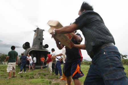 莫拉克臺(tái)風(fēng)引發(fā)大水重創(chuàng)南臺(tái)灣,臺(tái)軍“空特部”13日運(yùn)送300架次物資至災(zāi)區(qū),圖為寶來(lái)村民接力遞送空投物資。