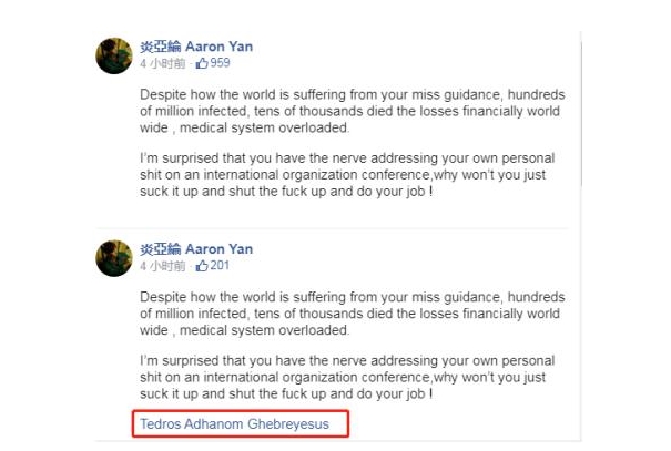 此外,臺灣知名藝人炎亞綸竟然也加入了對譚德塞的斥責(zé)。9日中午,炎亞綸在其臉書以英文指責(zé)譚德塞“誤導(dǎo)”世界,還指責(zé)稱“你竟然有勇氣在一次國際組織會議上發(fā)表你自己個人的屎一樣的言論”,“你為什么不干脆閉嘴、閉上你的臭嘴,做好自己的工作!”同時附上了譚德塞臉書的鏈接,隨后他又對貼文進(jìn)行編輯,去掉了此鏈接。