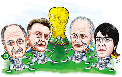 四強主帥列陣。左起:斯科拉里(巴西)、范加爾(荷蘭)、薩維利亞(阿根廷)、勒夫(德國)。趙乃育繪(新華社發)