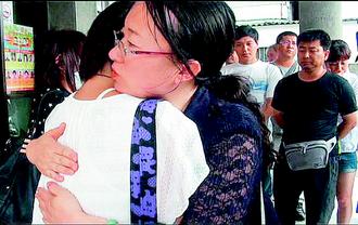 大陸籍領隊葉云(擁抱者右)昨將團員捐款,交給罹難司機施俊豪的家屬,輕擁施的女兒勸慰:“你要堅強、要照顧媽媽。”后面的團員都紅了眼眶。圖片來源:臺灣《聯合報》