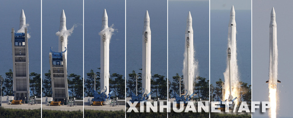 8月25日,在韓國南部的羅老宇航中心,韓國首枚運(yùn)載火箭“羅老”號(hào)發(fā)射升空(拼版照片)。韓國羅老宇航中心當(dāng)日宣布,“羅老”號(hào)運(yùn)載火箭應(yīng)于306公里高度進(jìn)行分離,但實(shí)際分離高度為342公里,二級(jí)火箭未進(jìn)入預(yù)定軌道,“屬于部分發(fā)射失敗”。新華社/法新