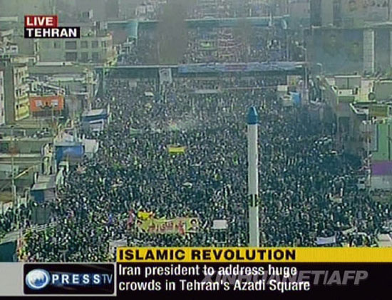 這張2月11日伊朗電視臺(tái)的電視截圖顯示,數(shù)十萬伊朗民眾在德黑蘭的自由廣場(chǎng)集會(huì),慶祝伊斯蘭革命勝利31周年。1979年2月1日,領(lǐng)導(dǎo)伊朗伊斯蘭革命的霍梅尼結(jié)束流亡生涯返回伊朗,巴列維王朝政權(quán)在2月11日倒臺(tái),伊朗伊斯蘭革命取得勝利。新華社/法新