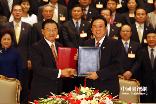海協會會長陳云林與;鶗麻L江丙坤互換協議文本。26日下午3時許,海協會會長陳云林與;鶗麻L江丙坤在南京紫金山莊正式簽署《海峽兩岸空運補充協議》、《海峽兩岸金融合作協議》、《海峽兩岸共同打擊犯罪及司法互助協議》。(中國臺灣網 鐘寶華 攝)