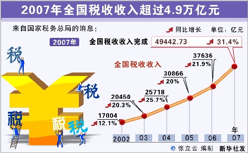 據國家稅務總局元旦快報,2007年全國稅收收入完成49442.73億元(不含關稅、契稅和耕地占用稅),比上年增收11806億元,增長31.4%。