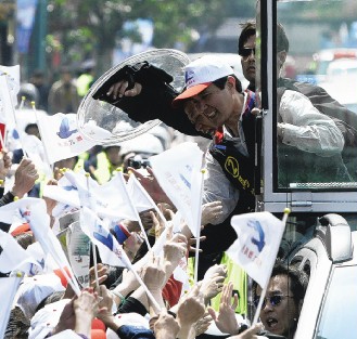 馬英九今天上午搭乘新款防彈車掃街,由于近來(lái)“刺馬”傳言不斷,他上車時(shí)特別用手敲打檢查防彈玻璃。(聯(lián)合晚報(bào)圖)