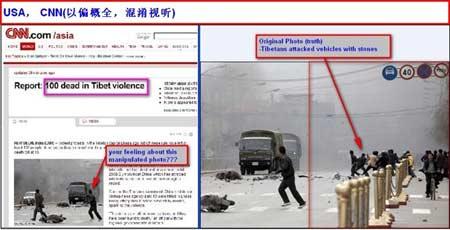 3月17日,CNN網站上使用了一張拉薩事件的圖片,圖中兩輛軍車正向兩名平民駛來--事實上,如果完整展示圖片的話,可以看到當時軍車旁有約10名暴徒在向軍車投擲石塊,顯然CNN網站的圖片故意剪裁了暴徒向軍車投擲石塊的圖像。