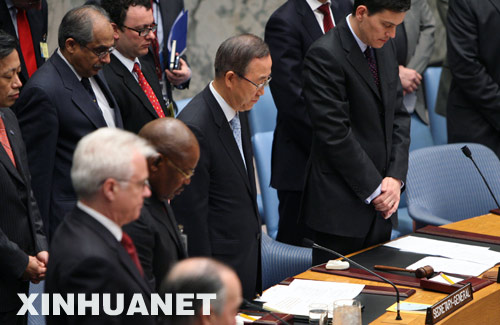 5月20日,在美國紐約聯(lián)合國總部舉行的聯(lián)合國安理會會議上,聯(lián)合國秘書長潘基文與安理會成員集體默哀,對中國四川汶川大地震遇難者表示哀悼。 新華社記者侯俊攝