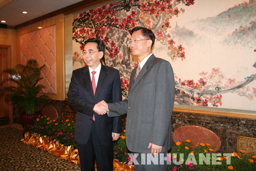 7月12日,應(yīng)中共廣州市委書記朱小丹邀請(qǐng),中國(guó)國(guó)民黨高雄市委員會(huì)廣州訪問團(tuán)搭乘高雄至廣州周末包機(jī)抵達(dá)廣州訪問。這是中共廣州市委書記朱小丹(左)與中國(guó)國(guó)民黨高雄市委員會(huì)主委許福明親切握手。 新華社發(fā)(閆潔 攝)