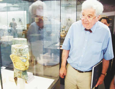 在“競(jìng)技——古代奧林匹克文物展”展廳,記者偶遇英國著名雕塑家、北京奧林匹克公園奧運(yùn)雕塑“從雅典到北京”的設(shè)計(jì)者司徒安,他是聽說首都博物館有三星堆和紅山遺址文物展覽,特地趕來參觀的。他表示,北京奧運(yùn)會(huì)賽場(chǎng)內(nèi)外洋溢著中國文化。