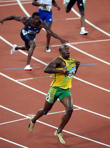 8月20日,牙買加選手博爾特(前)在沖過(guò)終點(diǎn)后慶祝。當(dāng)日,博爾特在北京奧運(yùn)會(huì)男子200米決賽中奪得冠軍并打破世界紀(jì)錄。博爾特在8月16日舉行的男子100米決賽中奪得金牌。新華社記者陳凱攝
