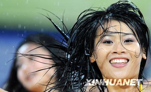 8月21日,沙灘寶貝比賽間隙在雨中激情表演。當(dāng)日,北京奧運(yùn)會(huì)沙灘排球女子冠軍爭(zhēng)奪戰(zhàn)和3-4名決賽在朝陽(yáng)公園沙灘排球場(chǎng)舉行。新華社記者格桑達(dá)瓦攝