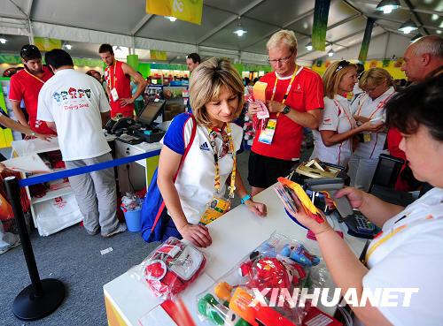 8月19日,顧客正在收銀臺(tái)結(jié)賬。 連日來(lái),前往北京奧運(yùn)村內(nèi)的北京奧運(yùn)會(huì)特許商品零售店購(gòu)買紀(jì)念品的顧客增多,部分已經(jīng)結(jié)束比賽的運(yùn)動(dòng)員臨別之前紛紛來(lái)到這里,為親朋選購(gòu)具有中國(guó)特色的禮物。 新華社記者李紫恒攝