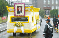 行駛在陣陣細(xì)雨中的靈車,采傳統(tǒng)的黃、白菊花裝飾,跟著后頭的家屬車輛,也沒有任何裝飾,要不是靈車前方王永慶的遺照,光從排場,實(shí)在看不出里面載著的是臺灣“經(jīng)營之神”的棺木。(高大林)
