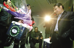 昨天晚上6時多,俞康和陳怡抱著冷藏箱步出杭州蕭山國際機場。