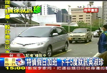 報道稱,臺特偵組今天下午再度就訊吳淑珍,派出了林嚞慧、李海龍及周士榆等3位檢察官,3輛偵防車中也裝載了錄音、錄像器材,而鄰近的臺北醫學院也隨時待命協助。