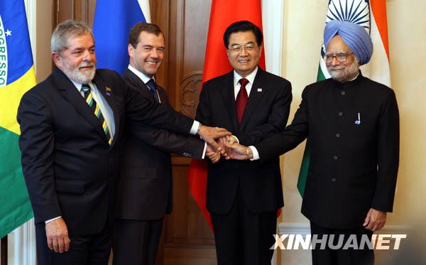 6月16日,中國、巴西、俄羅斯和印度“金磚四國”領導人在俄羅斯葉卡捷琳堡舉行首次正式會晤,中國國家主席胡錦濤出席會晤。這是胡錦濤主席和巴西總統盧拉、俄羅斯總統梅德韋杰夫、印度總理辛格合影。新華社記者姚大偉攝
