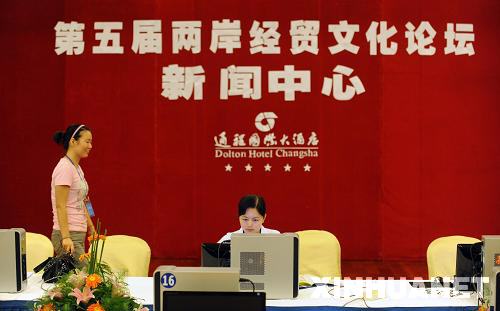 7月10日,兩位記者在長沙通程國際大酒店內(nèi)的新聞中心工作。由中共中央臺辦海研中心和中國國民黨國政研究基金會共同主辦的第五屆兩岸經(jīng)貿(mào)文化論壇將于7月11日至12日在長沙舉行。目前,論壇的主會場、新聞中心和賓客下榻賓館的各項(xiàng)準(zhǔn)備工作已經(jīng)就緒。新華社記者 李尕?cái)z