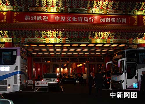 由中共中央委員、原河南省委書記徐光春率領的河南省參訪團14日抵臺,入住著名的臺北圓山大飯店。圖為圓山大飯店為此特地掛出“熱烈歡迎中原文化寶島行參訪團”條幅。作者:陳立宇