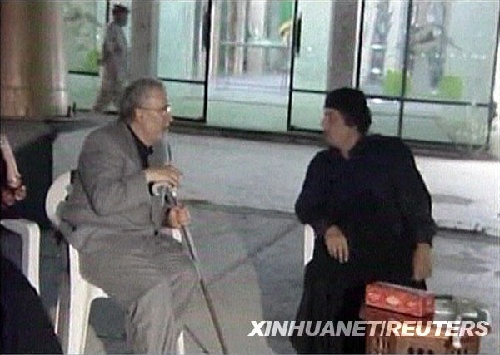 這張8月21日的視頻截圖顯示,利比亞領(lǐng)導(dǎo)人穆阿邁爾卡扎菲(右)在利比亞首都的黎波里與提前獲釋回國(guó)的洛克比空難制造者邁格拉希交談。邁格拉希身患晚期前列腺癌,經(jīng)過(guò)利比亞官員與蘇格蘭司法部門(mén)的協(xié)商,邁格拉希提前結(jié)束在蘇格蘭的刑期。美國(guó)白宮發(fā)言人吉布斯21日抨擊利比亞方面為提前獲釋回國(guó)的洛克比空難制造者邁格拉希舉行歡迎活動(dòng)。新華社/路透