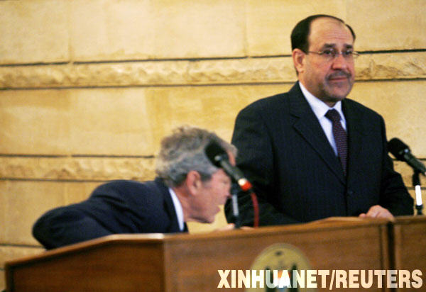 2008年12月14日,在伊拉克首都巴格達舉行的記者會上,美國前總統布什(左)彎腰躲避襲擊。當日,一名伊拉克記者在布什與伊拉克總理努里·馬利基(右)召開的聯合新聞發布會上脫下自己的鞋,扔向布什。 新華社/路透