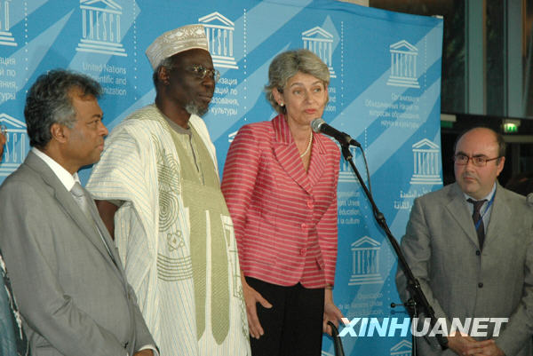 9月22日,在法國首都巴黎,被提名為聯合國教科文組織下任總干事候選人的博科娃(右二)向媒體發表講話。當日,聯合國教科文組織執行局在巴黎就下屆總干事提名人選進行了第五輪投票,結果保加利亞前外交部長伊琳娜·博科娃勝出,成為唯一候選人。她將由下月舉行的第35屆聯合國教科文組織大會批準成為新任總干事。新華社記者李學梅攝