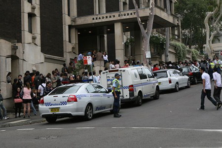 在位于莫瑞迪安國際教育集團旗下的悉尼校區,聽說學校倒閉的學生們聚焦在一起,警察也趕來維持學校秩序。