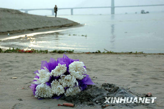 10月26日,江灘邊擺放的鮮花寄托著人們對年輕英雄的懷念。24日,面對落入湍急江水的少年,長江大學14名大學生不顧自身安危,紛紛跳入水中救人。手挽手組成的“人梯”,挽救了兩名孩童如花的生命,而陳及時、何東旭、方招3名大學生,卻獻出了年僅19歲的生命。