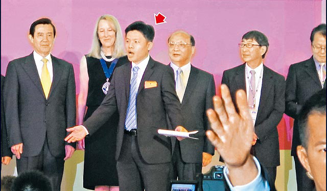 男子(箭頭處)趁馬英九與臺中市長胡志強等人合影時沖上主席臺用英文抗議,臺下隨扈(右前)沒聽懂陳說內容,忙著遮擋記者拍照角度。(圖片來自臺媒)