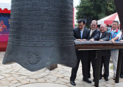 八二三炮戰55周年,23日在金門古寧頭和平紀念園區舉辦敲和平鐘祈福活動,馬英九(左起)與縣長李沃士等人敲響和平鐘。臺灣“中央社”
