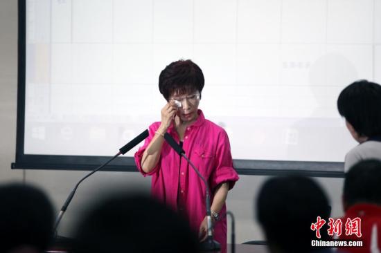 圖為洪秀柱在民調(diào)揭曉后與媒體及支持者見(jiàn)面時(shí),以紙巾擦拭眼角。黃少華 攝