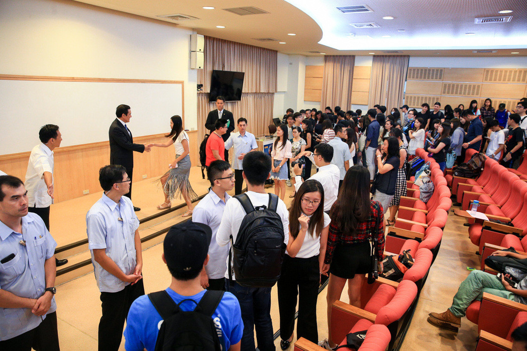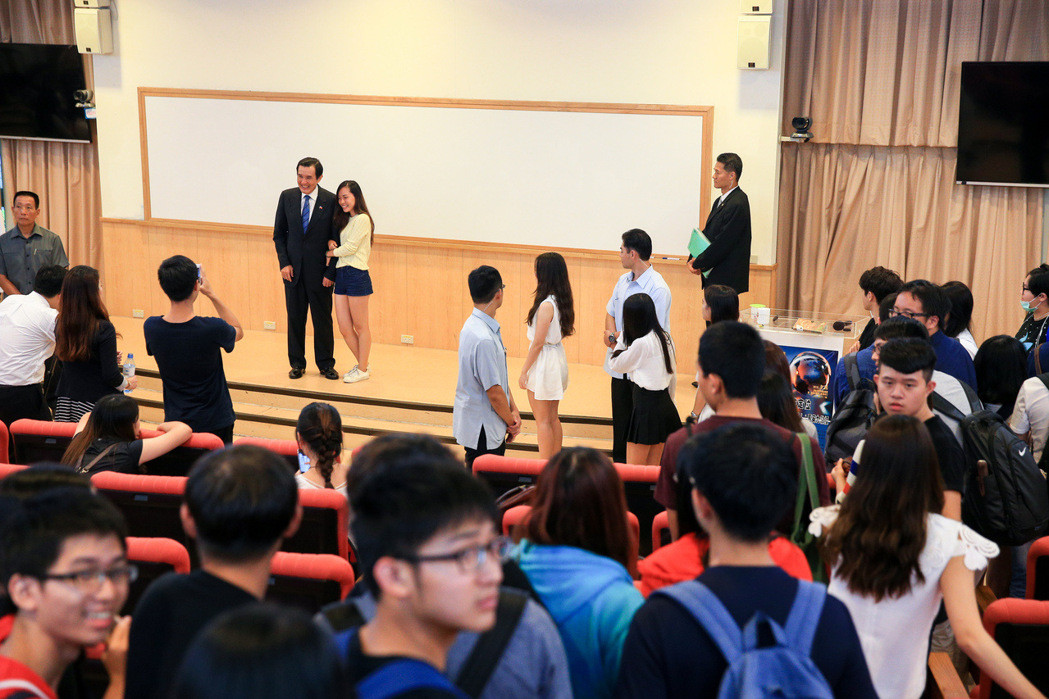 演講結束后,開放學生與“馬老師”合照,吸引學生大排長龍等待合影,POSE從最基本的握手、勾手臂、搭肩膀到擁抱,顯示馬英九卸任后人氣依然不減。