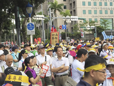 臺灣監(jiān)督年金改革行動聯(lián)盟10月16日前往“立法院”,舉行“程序不正義,何來共識?堅決反對民進黨所提出之65歲延退方案”記者會,要求當局領導人蔡英文考慮“年金改革委員會執(zhí)行長”林萬億是否適任,避免影響年金改革。早在9月3日,臺灣逾10萬名軍公教(軍人、公務人員、教師)數(shù)十年來首次走上街頭,抗議在退休年金改革中被民進黨當局抹黑。