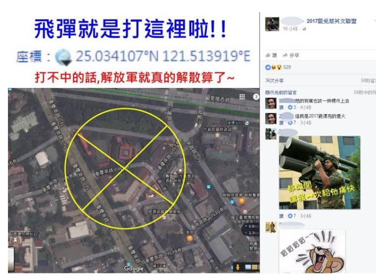 1月2日晚,名為莊士弘的臺(tái)灣網(wǎng)友在Facebook上轉(zhuǎn)發(fā)了一張“總統(tǒng)府”的衛(wèi)星地圖,圖片上專門用黃色標(biāo)記圈起位置,并“貼心”地附上詳細(xì)坐標(biāo),還給解放軍撂下這樣兩句話:“飛彈就是要打這里啦!打不中的話,解放軍真的解散算了!”。