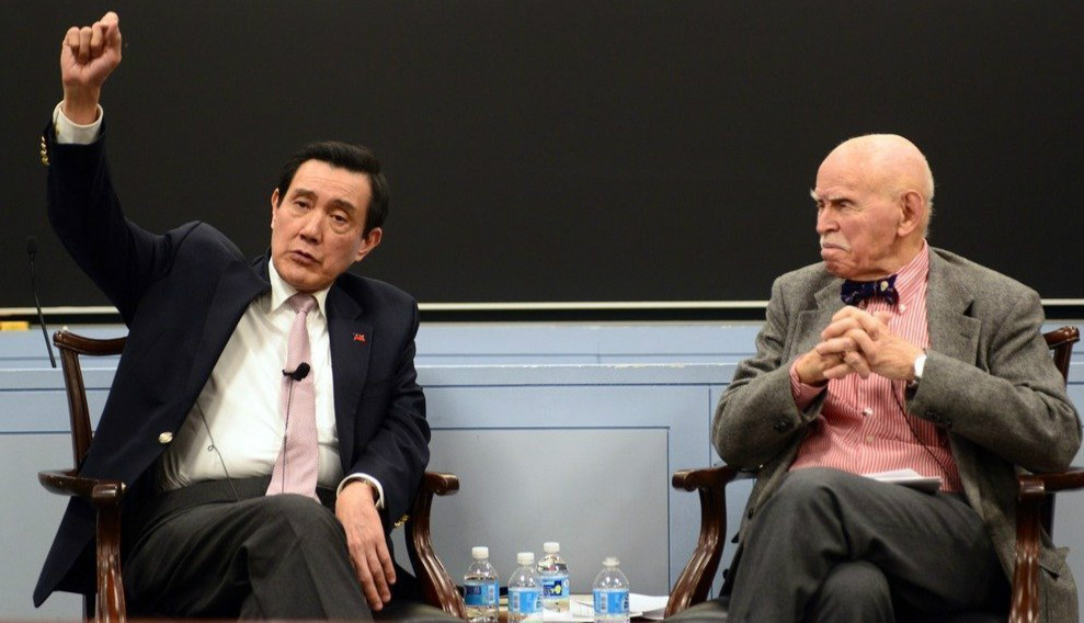 馬英九(左)2日應邀在紐約大學法學教授孔杰榮的課堂上座談(圖片來源:臺“聯合新聞網”)