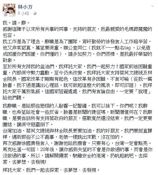 林育卉在文中還聲稱,自己辭職“是給那些戀棧的人敲響一記警鐘,我可以舍下,你們呢?我辭職,也希望給社會一些反省,臉書是新聞的捷徑嗎,新聞價值何在?我辭職,是要告訴所有支持蔡‘政府’的朋友,選戰(zhàn)竟然還沒結(jié)束,我們一定更要團結(jié),讓保守惡靈倒下”。