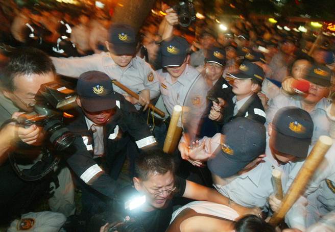 2008年,國民黨榮譽主席連戰(zhàn)宴請時任海協(xié)會長陳云林,民進黨在飯店外煽動沖突,許多警察、采訪記者與民眾紛紛倒地。(臺灣“中時”報系資料圖)