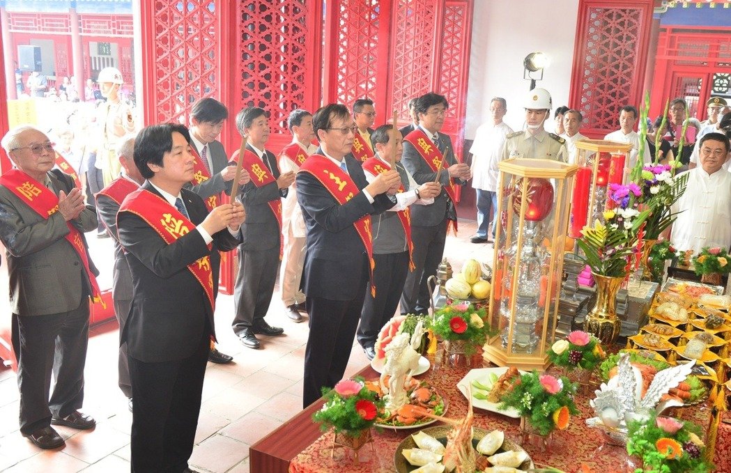 每年,臺南延平郡王祠都會舉辦鄭成功祭典,圖為2016年祭典由當時的臺“內(nèi)政部長”陳威仁(前排左二)及臺南市長賴清德(前排左)主祭。(圖片來源:臺“聯(lián)合報”)