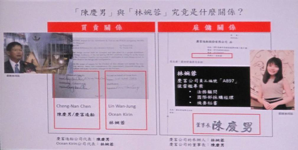 馬文君直接出示慶富與OCEAN KIRIN簽約的負責人簽名文件,質疑該交易疑點重重。(臺媒圖)