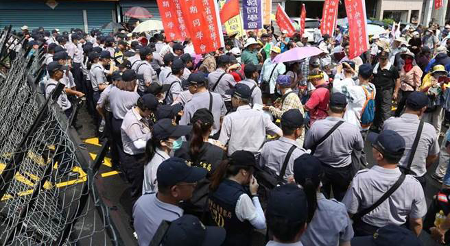 蔡英文6日南下高雄燕巢天后宮參拜,遭到軍公教人士群聚抗議,現場動員大批警察戒備并以層層拒馬隔開抗議群眾。(圖片來源:臺灣“中時電子報”)