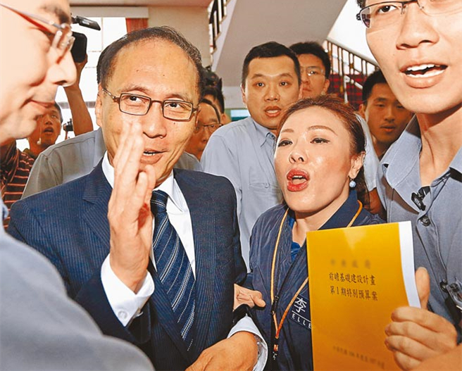 臺灣“立院”13日下午召開臨時會,臺當局“行政院長”抵“立院”時從側門進議場,但還是被國民黨“立院”黨團副書記長李彥秀(右二)拿著預算書表達抗議。國民黨女力表現強悍,成議場內最吸睛的一群。(圖片來源:臺灣《中國時報》)