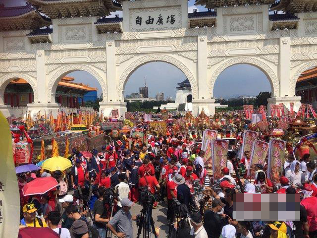 眾神上凱道活動,下午二時由中正紀念堂出發,進行繞境,前往凱達格蘭大道。主辦單位表示有五萬人參與。(圖片來源:中評社)