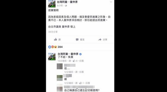童仲彥曾是民進(jìn)黨臺(tái)北市議員,因?yàn)榧冶⑼庥鲲L(fēng)波鬧得沸沸揚(yáng)揚(yáng)后宣布退出民進(jìn)黨,但疑似忘記切換帳號(hào),自己留言“了不起,負(fù)責(zé)”,淪為各界笑柄。