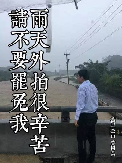 今年6月臺(tái)灣北部淹水,“時(shí)代力量立委”黃國(guó)昌回新北選區(qū)勘災(zāi)。照片中,一旁的人撐著傘或穿雨衣,僅他一人濕身一片,但遭到大批網(wǎng)友諷刺上演“濕背秀”。網(wǎng)友惡搞改圖狠酸黃國(guó)昌是“立法院最佳演員”、“雨天外拍很辛苦,請(qǐng)不要罷免我”、“難道濕身比較帥?”、“時(shí)力買不起雨衣?”等。