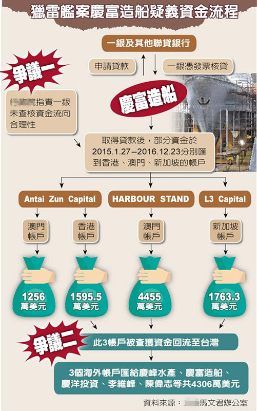 馬文君指出,慶富往Antai Zun Capital香港賬戶匯了1595.5萬美元、HARBOUR STAND澳門賬戶有4455萬美元、L3 Capital新加坡賬戶有1763.3萬美元,這三筆賬戶有資金回流到臺灣,匯往慶峰水產、慶富造船、慶洋投資,以及慶富相關人士利瓦伊峰以及陳偉志的戶頭,共4306萬美元,約13億新臺幣。