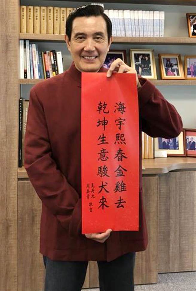 馬英九親筆狗年春聯,“海宇熙春金雞去,乾坤生意駿犬來”,還有妻子周美青雙重祝福。(圖片來源:臺灣《中時電子報》)