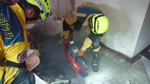 臺中市消防特搜隊挺進災區大樓救援,經消防隊連夜救援,尋獲2名受困員工。(圖片來源:臺灣“中時電子報”)
