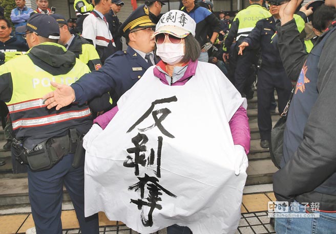 反軍人年改團體27日突襲“立法院”,一位抗議者在身上穿著“反剝奪”布條表達不滿。(圖片來源:臺灣《中時電子報》)