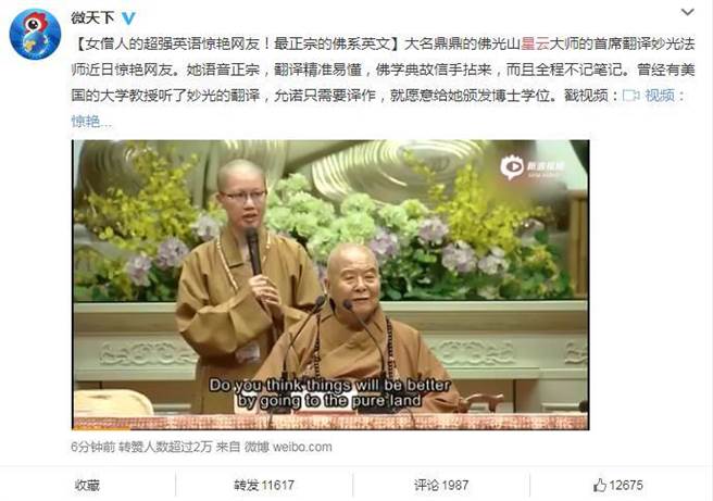 星云法師女弟子妙光的口譯片段,引發(fā)網(wǎng)友討論話題。(圖片來源:臺(tái)灣“中時(shí)電子報(bào)”)