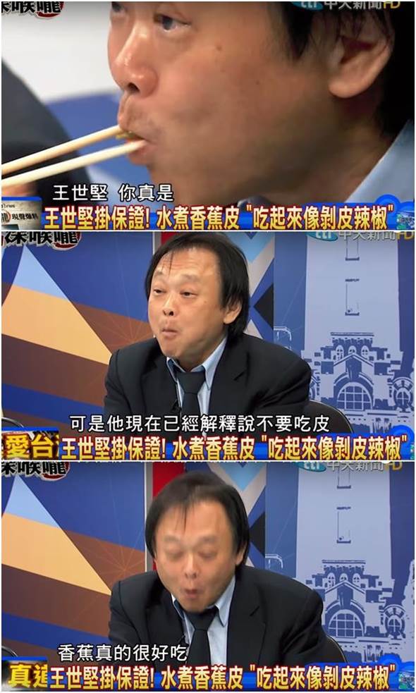 賴清德日前推薦民眾生香蕉帶皮水煮,之后搭配醬油、大蒜蘸吃,還稱這種吃法“養生又美味”。但王世堅卻誤解是連皮一起吃下肚,并公開在某政論節目中吃了起來,一邊吃一邊大贊香蕉皮像“剝皮辣椒”、“還蠻好吃的”。