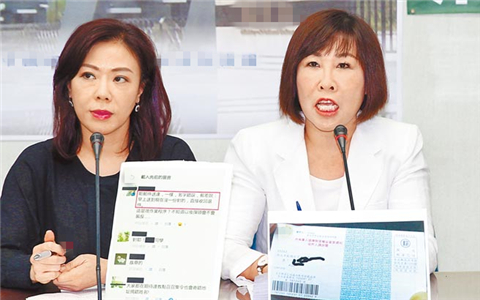 國民黨“立法院”黨團28日舉行記者會,“立委”呂玉玲(右)、李彥秀面前放著通知函照片等,痛批防務主管部門人名錯置、級數算錯等,大擺烏龍。(圖片來源:臺灣《中時電子報》)